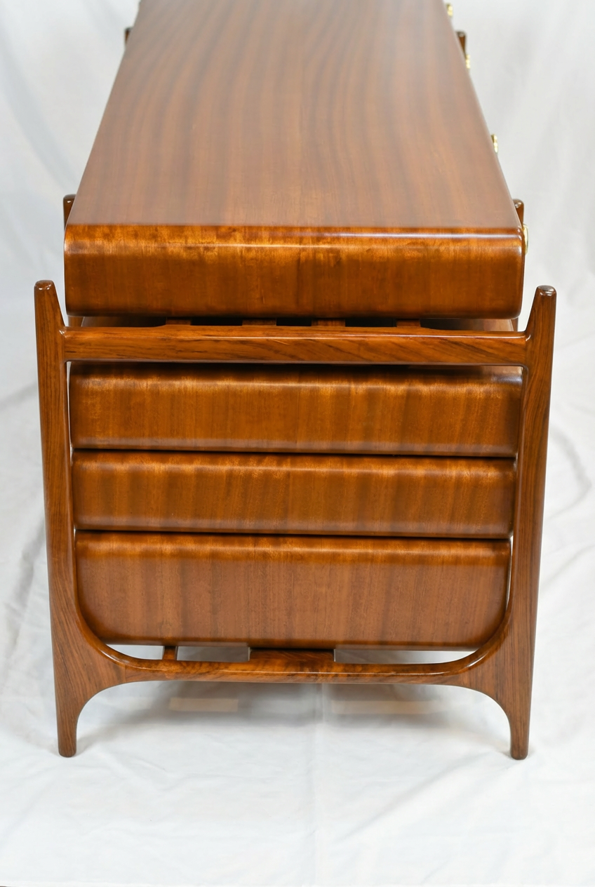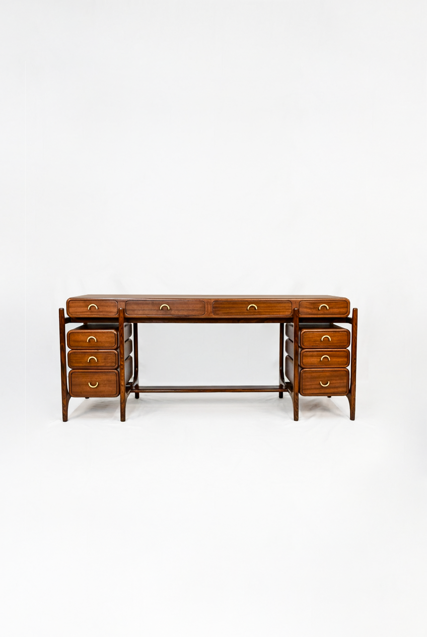 The Sao Paulo Desk features a dual-timber construction of Sapele and Shisham wood, finished naturally to highlight the contrasting grain patterns of the two species. Its architectural silhouette is defined by clean lines and a minimalist frame, supporting a workspace with two integrated drawers. Functional hardware consists of understated solid brass handles that provide a refined tactile element and a subtle metallic accent. The design prioritizes structural clarity and material integrity, resulting in a functional executive piece suitable for professional environments.