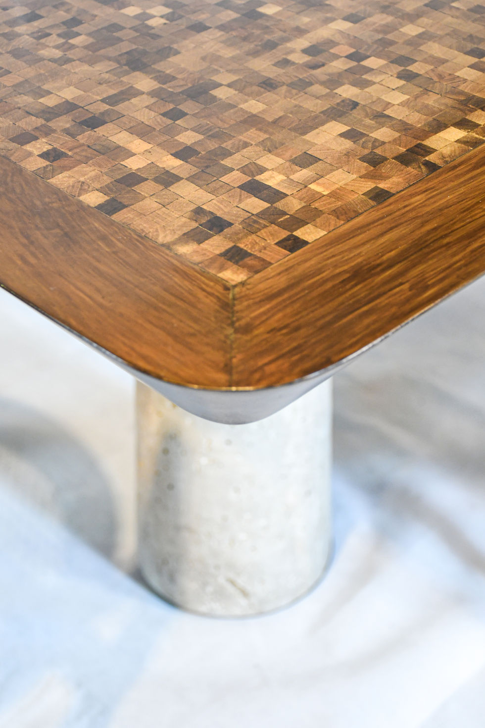 Designed around material clarity and structural logic, the Urku dining table seats twelve and expresses its construction with quiet confidence. An oak frame holds a walnut mosaic, the varied grain and tone of natural variations in the wood giving depth and texture to the expansive surface. Six monolithic legs in solid travertine, support the table enriching it with a sense of permanence and weight. A concealed electroplated metal subframe provides additional structural strength, allowing the stone and timber to remain visually primary. Urku brings together craft, structure, and durability in a composed and enduring form.